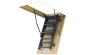 Лестница складная металлическая FAKRO LMS - базовая модель металлической складной лестницы. Утеплённая крышка люка бежевого цвета гармонично вписывается в потолок, обшитый древесиной. Представляет собой складную конструкцию из металлического лестничного марша и термоизоляционной крышки люка.